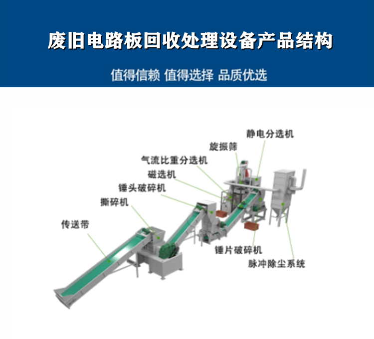 廢舊電路板回收處理設(shè)備破碎分離廢電子電路板回收金屬資源工藝:拆解-輸送-破碎-粉碎-改進(jìn)振動(dòng)系統(tǒng)-篩選-分選-除塵,工藝成熟,環(huán)保達(dá)標(biāo);金屬固體廢料、剪切破碎機(jī)、錘式破碎機(jī);破碎混合物進(jìn)入旋風(fēng)分級(jí)機(jī),非金屬粉塵進(jìn)入袋式除塵器;大于60目的材料粉末進(jìn)入振動(dòng)篩,通過(guò)振動(dòng)篩選出;60目、40目、20目、10目的物料;10目以內(nèi)的物料送至可調(diào)速錘式破碎機(jī)進(jìn)行二次破碎;20目以下的物料送至高壓靜電分揀機(jī),金屬和非金屬粉末通過(guò)多個(gè)固定在中軸上的除塵板旋轉(zhuǎn)分離;分離后的金屬粉末通過(guò)電解生產(chǎn)線實(shí)現(xiàn)各種金屬的高純度分離。
